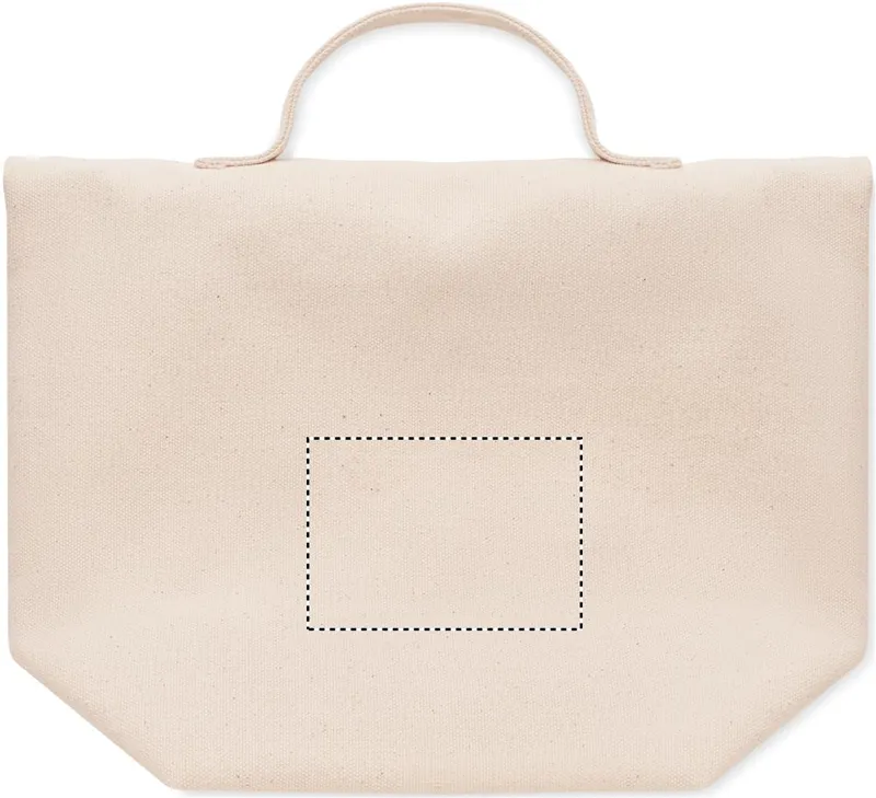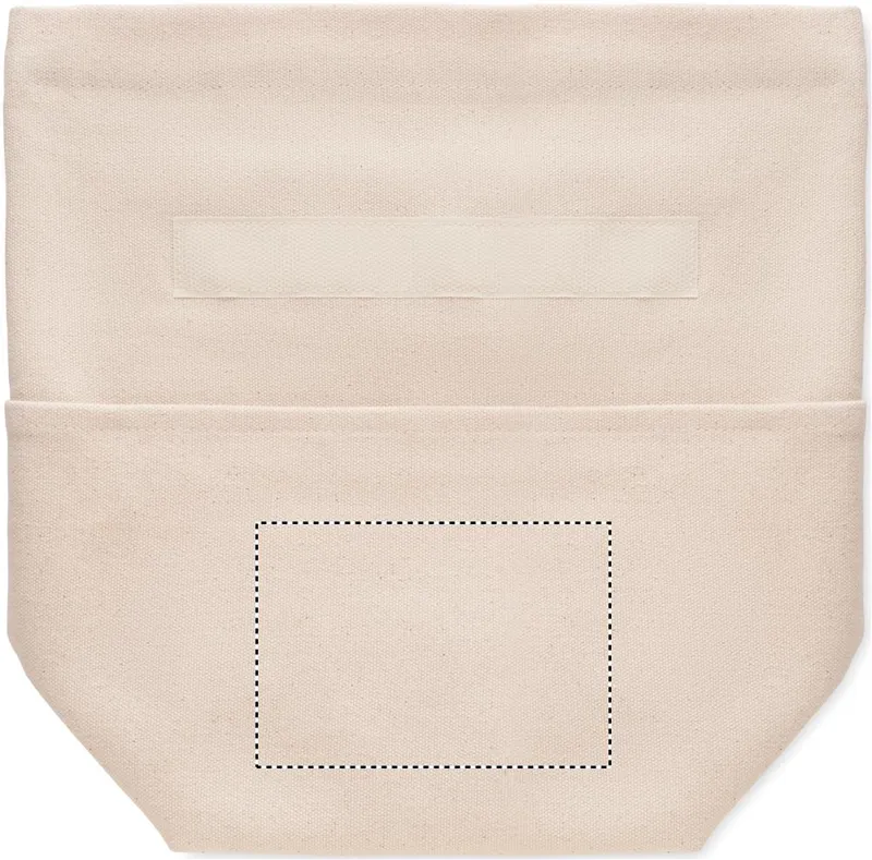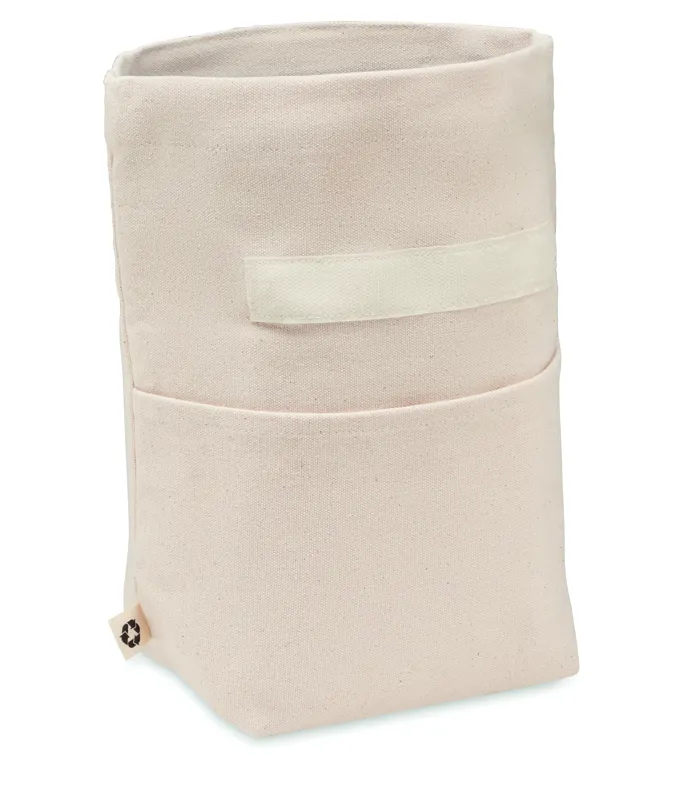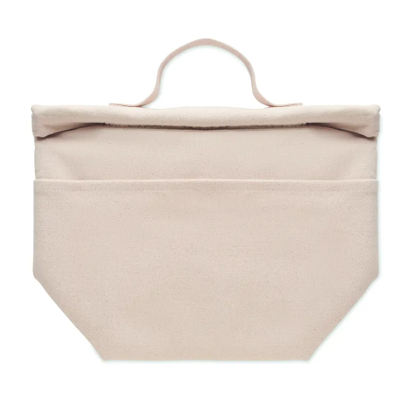 Újrahasznosított kevertszálas (70% újrahasznosított pamut, 30% újrahasznosított poliészter) hőszigetelt uzsonnás táska, roll top csavart, tépőzáras záródással. Szigetelés: 3 mm-es PE hab 12C PEVA-val.
