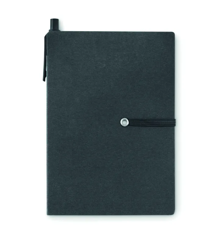 Jegyzetfüzet öntapadós jegyzetelőkkel és golyóstollal. Puha, újrahasznosított kartonborító. Cérnafűzött. 140 vonalas oldal (70 lap). Nagy és közepes méretű sárga öntapadós jegyzettömbök és 4 különböző színű lapjelző. Hozzáillő nyomógombos golyóstoll újrahasznosított kartonból, ABS szerelvényekkel. Feketén író betéttel. Elasztikus zárópánt. FSC®-certified | FSC MIX, P7.1, FSC-C213206