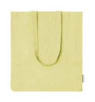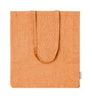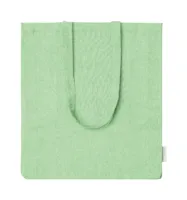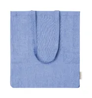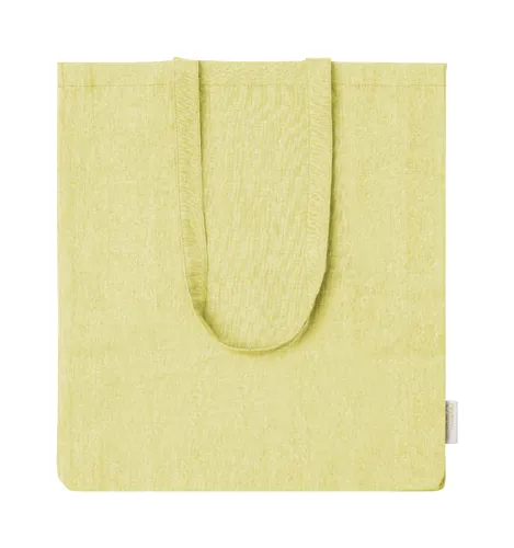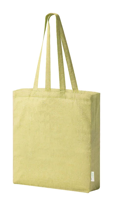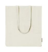 Újrahasznosított pamut bevásárlótáska, hosszú hordfüllel, betoldással és megkülönböztető újrahasznosított pamut címkével. 100% újrahasznosított pamut, 140 g/m².