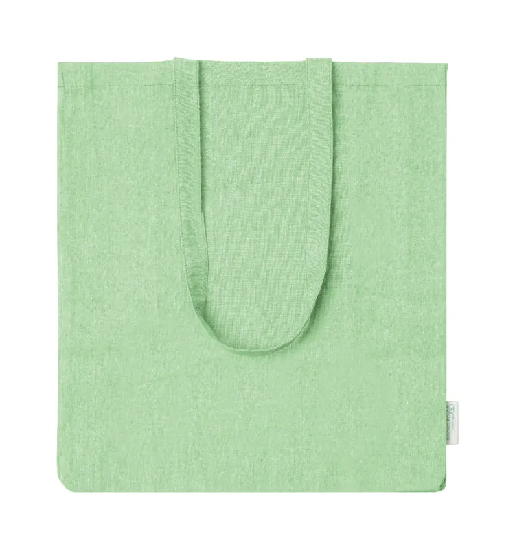 Újrahasznosított pamut bevásárlótáska, hosszú hordfüllel, betoldással és megkülönböztető újrahasznosított pamut címkével. 100% újrahasznosított pamut, 140 g/m².