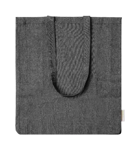 Újrahasznosított pamut bevásárlótáska, hosszú hordfüllel, betoldással és megkülönböztető újrahasznosított pamut címkével. 100% újrahasznosított pamut, 140 g/m².