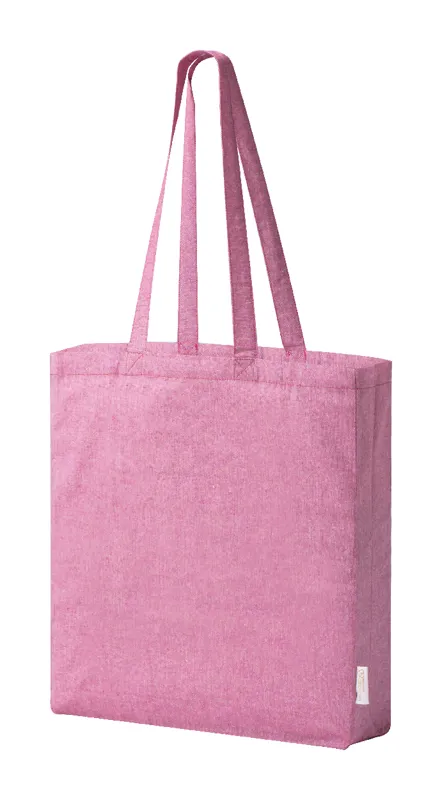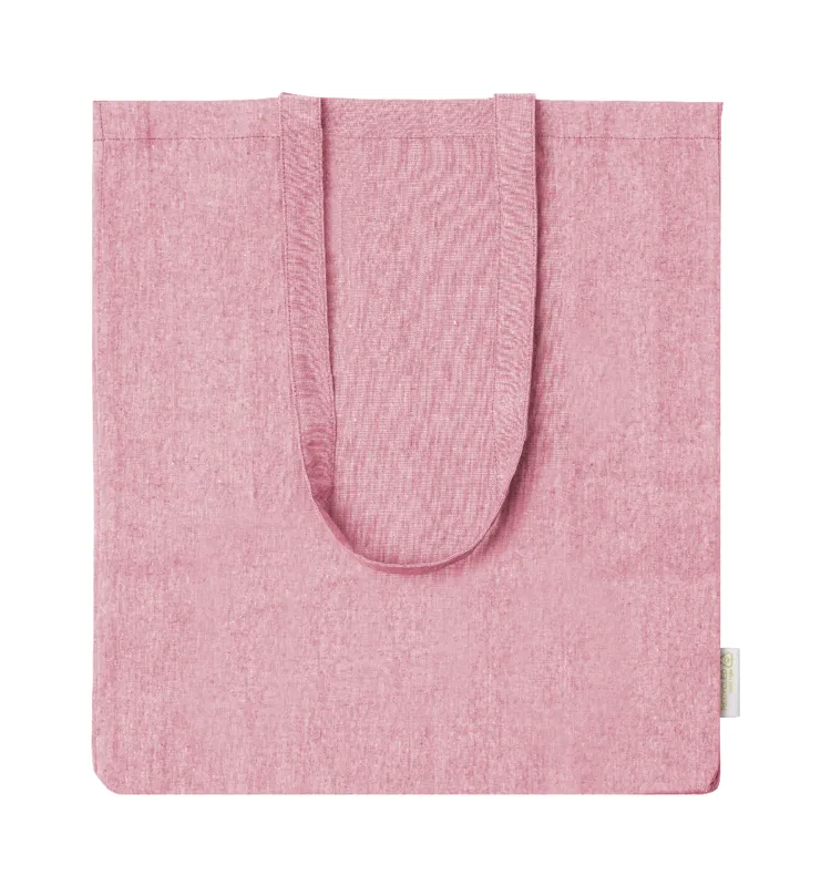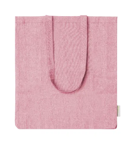 Újrahasznosított pamut bevásárlótáska, hosszú hordfüllel, betoldással és megkülönböztető újrahasznosított pamut címkével. 100% újrahasznosított pamut, 140 g/m².