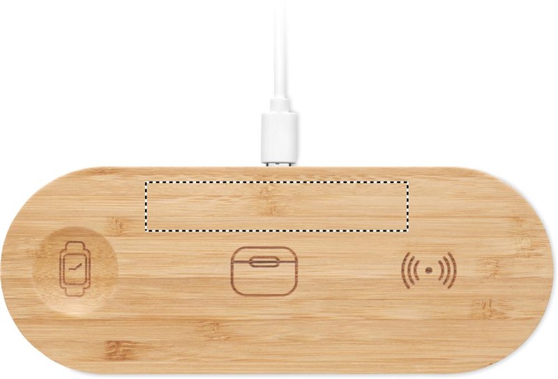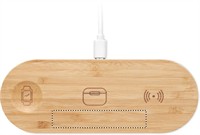 3 az 1-ben töltőállomás bambusz házban. Tartalmaz egy 15 W-os vezeték nélküli töltőt, egy okosóra-töltőt (csak Apple®) és egy TWS töltőt.
