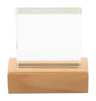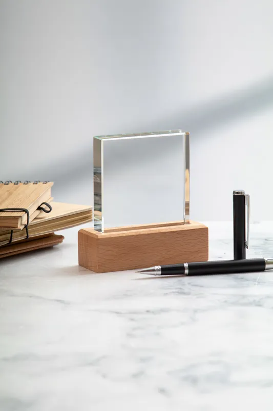 Üvegtrófea bükkfa alappal, kraft papír ajándékdobozban.