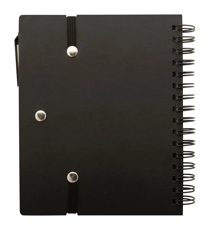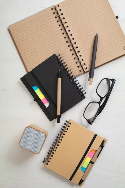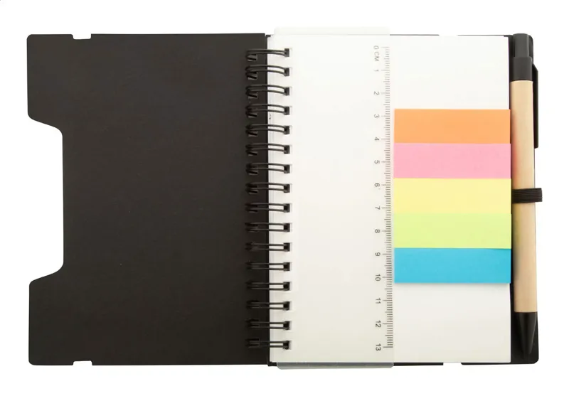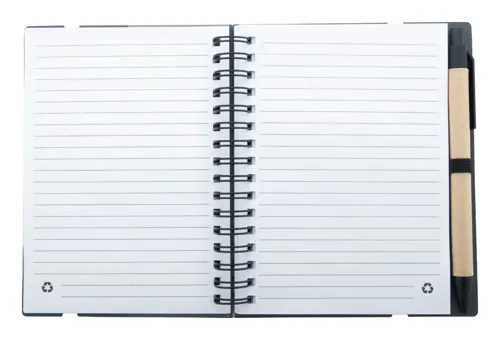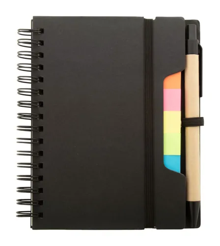 Újrahasznosított papírból készült spirálfüzet 70 vonalas lappal és 125 oldaljelölővel (5 különböző színben). Gumipánttal és tolltartóval. A6 méretű. Újrahasznosított papírból készült golyóstollal és kék tollbetéttel szállítjuk.