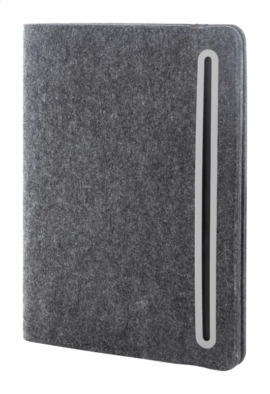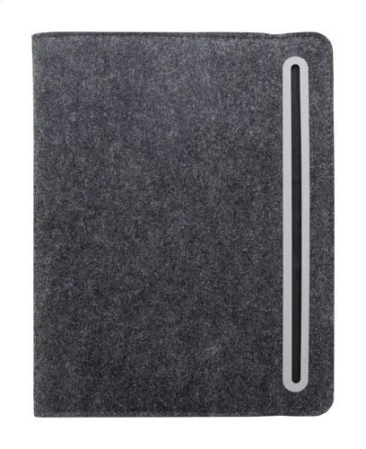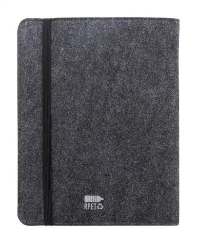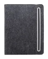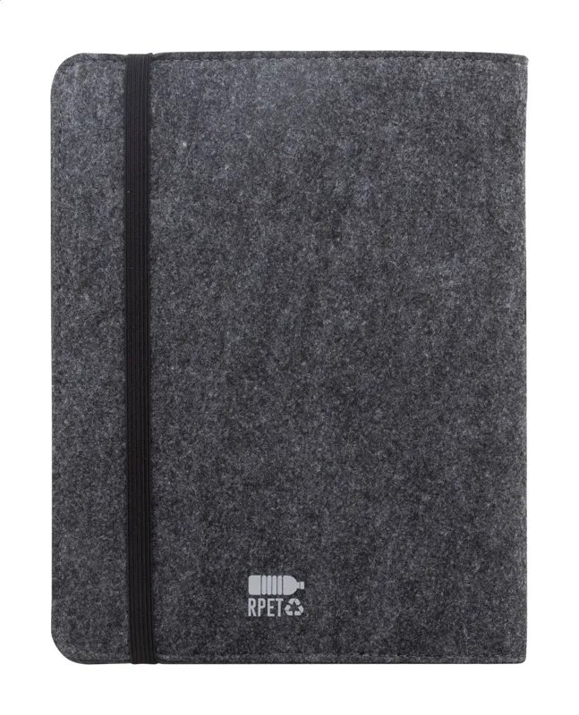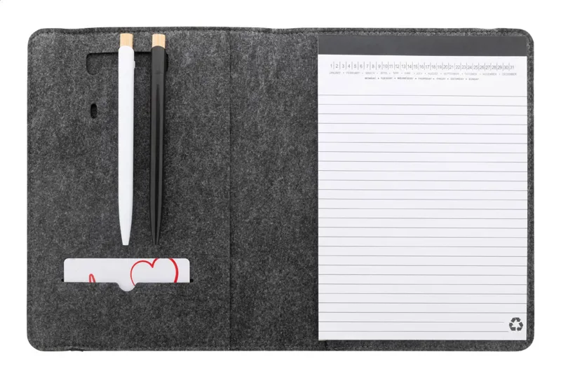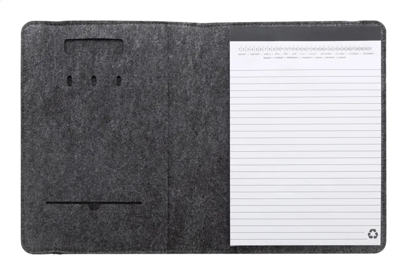 A5-ös méretű, RPET filc iratmappa elülső és több belső rendezőzsebbel. 20 vonalas jegyzettömbbel újrahasznosított papírból.
