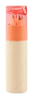 6 db-os rövid, színes ceruza, karton henger tokban, színes műanyag kupakkal, a kupak tetején hegyező...