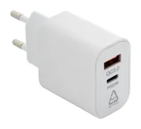 Újrahasznosított ABS műanyag fali gyorstöltő 1 USB és 1 UBS-C porttal. Gyorstöltő technológiával (PD...