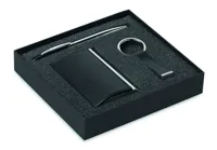Egyedi bőrmintával díszített irodai szett, mely tartalmaz golyóstollat, névjegykártyatartót és kulcs...