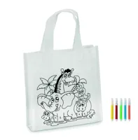 Nemszőtt anyagú mini bevásárlótáska. 5 színező filccel. 80 g vastag anyag.