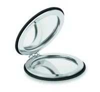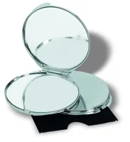 Krómozott fém sminktükör, sima és nagyítós oldallal. Bársonytokban.