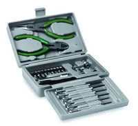 Szerszámkészlet alumínium tokban. Tartalma: 1 laposfogó, 1 oldalcsípő fogó, 1 csavarhúzó nyél, 1 hos...