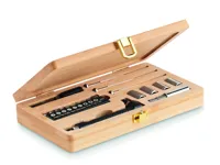 15 részes szerszámkészlet bambusz tokban. Tartalmaz 6 bitfejet tartóban: 3 lapos méretet, 2 csillag ...