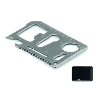 Rozsdamentes acél, bankkártya formájú multiszerszám 11 funkcióval, PU bőr tokban szállítjuk.
