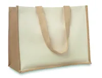 Bevásárlótáska laminált juta és laminált pamut keverékéből, hosszú hordfüllel.