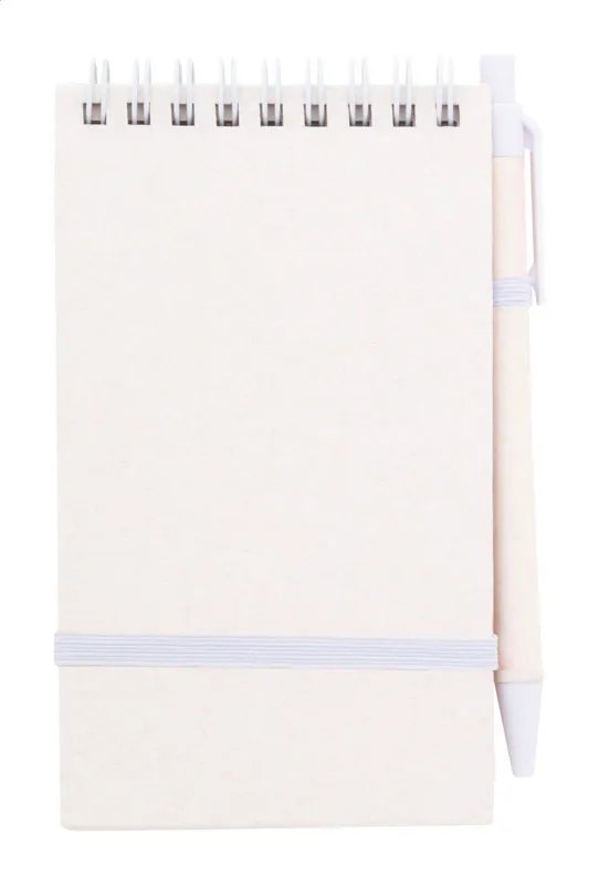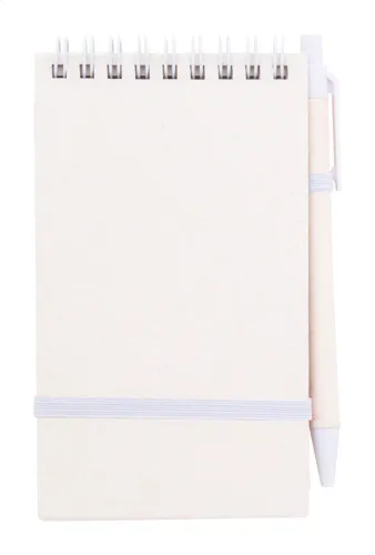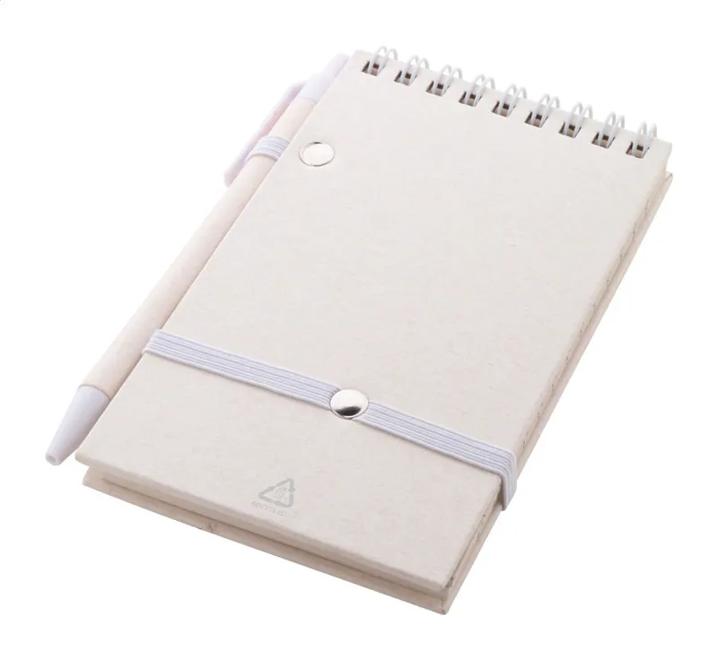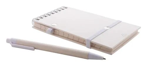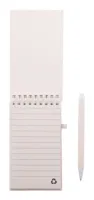 Újrahasznosított tejesdoboz anyagú spirálfüzet kemény borítóval és 70 vonalas lappal. Hozzáillő színű spirálgyűrűkkel, gumipánttal és tolltartóval. Újrahasznosított tejesdoboz és újrahasznosított ABS műanyag golyóstollal, kék tollbetéttel. A6 méretű.