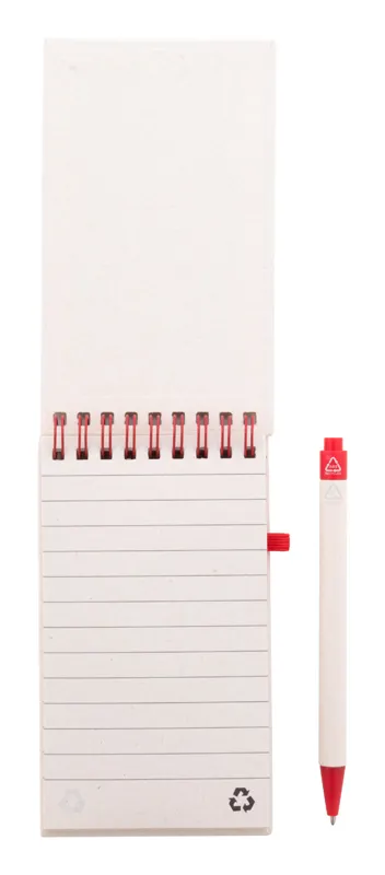 Újrahasznosított tejesdoboz anyagú spirálfüzet kemény borítóval és 70 vonalas lappal. Hozzáillő színű spirálgyűrűkkel, gumipánttal és tolltartóval. Újrahasznosított tejesdoboz és újrahasznosított ABS műanyag golyóstollal, kék tollbetéttel. A6 méretű.