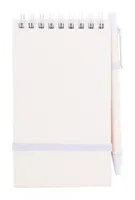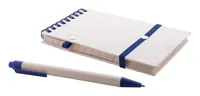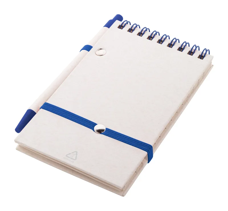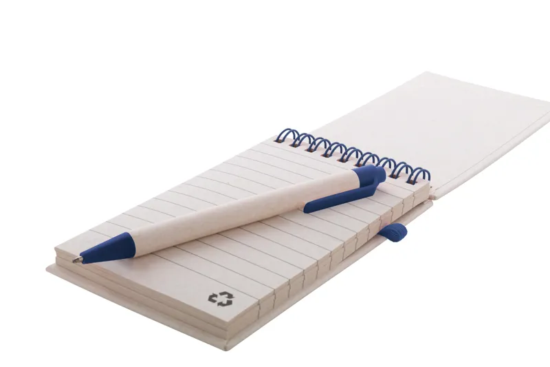 Újrahasznosított tejesdoboz anyagú spirálfüzet kemény borítóval és 70 vonalas lappal. Hozzáillő színű spirálgyűrűkkel, gumipánttal és tolltartóval. Újrahasznosított tejesdoboz és újrahasznosított ABS műanyag golyóstollal, kék tollbetéttel. A6 méretű.