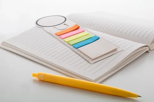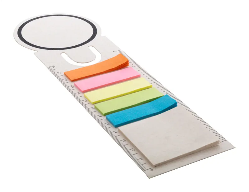 Újrahasznosított tejesdoboz könyvjelző és vonalzó 15 öntapadós jegyzetlappal és 75 oldaljelölővel (5 különböző színben).
