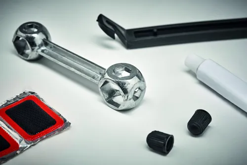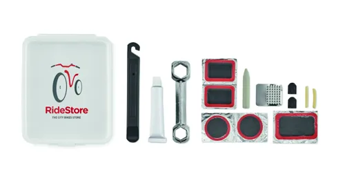 Kerékpárjavító készlet 1 csavarkulccsal, 2 gumikarral, 1 ragasztóval, 2 szelepsapkával, 2 szelepcsővel, 1 csiszolóval, 5 javítófolttal. Átlátszó dobozban.
