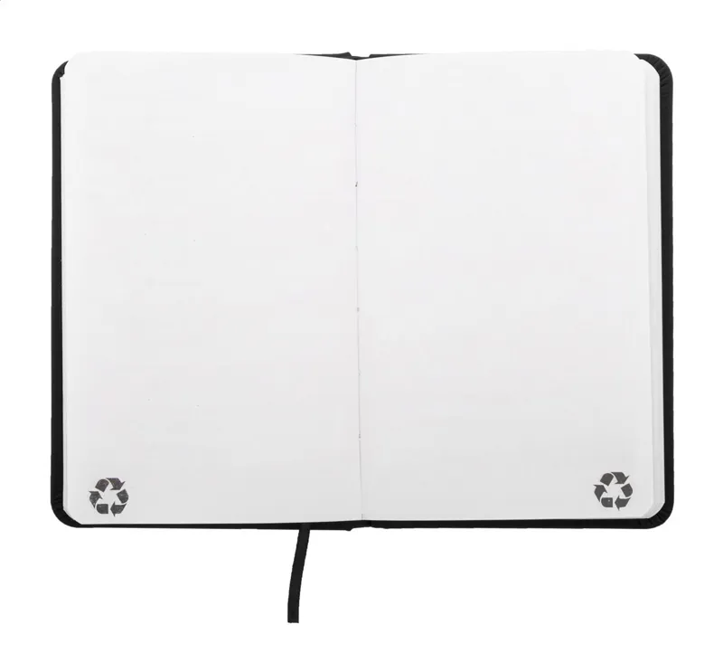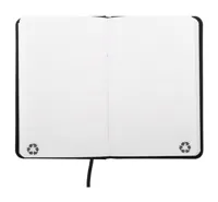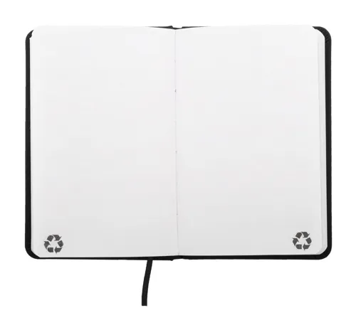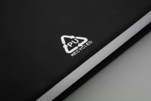 Úrahasznosított PU bőr borítású jegyzetfüzet újrahasznosított papírból készült 100 sima lappal. Hozzáillő színű gumipánttal és könyvjelzővel. A6 méretű.