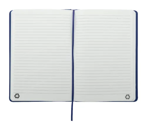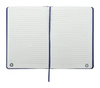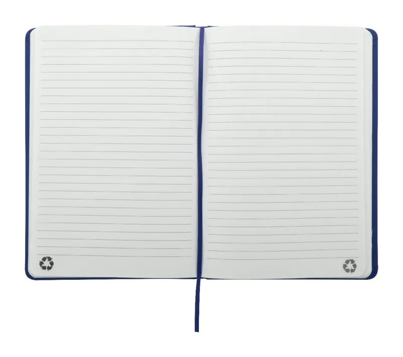 Újrahasznosított PU bőr borítású jegyzetfüzet 100 vonalas lappal, újrahasznosított papírból. Megegyező színű könyvjelzővel és gumiszalaggal. A5 méretű.