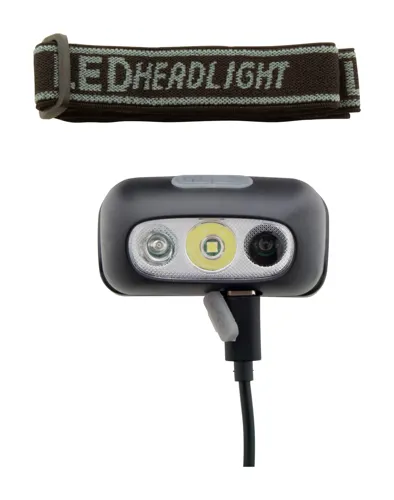 Műanyag fejlámpa beépített USB újratölthető akkumulátorral (400 mAh) és állítható pánttal. Nagy teljesítményű COB fénnyel és kettős mozgásérzékelővel. Magas, alacsony és mozgásérzékeny fénymódokkal. USB töltőkábellel szállítjuk.