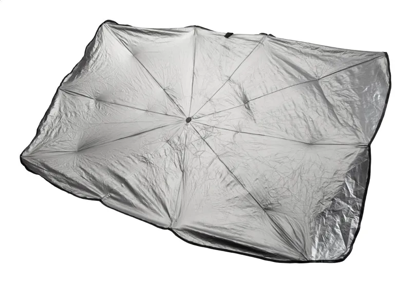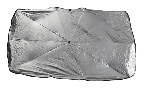 Kihajtható autós napellenző ernyő szélvédőre fém szegéllyel, poliészter tasakban.