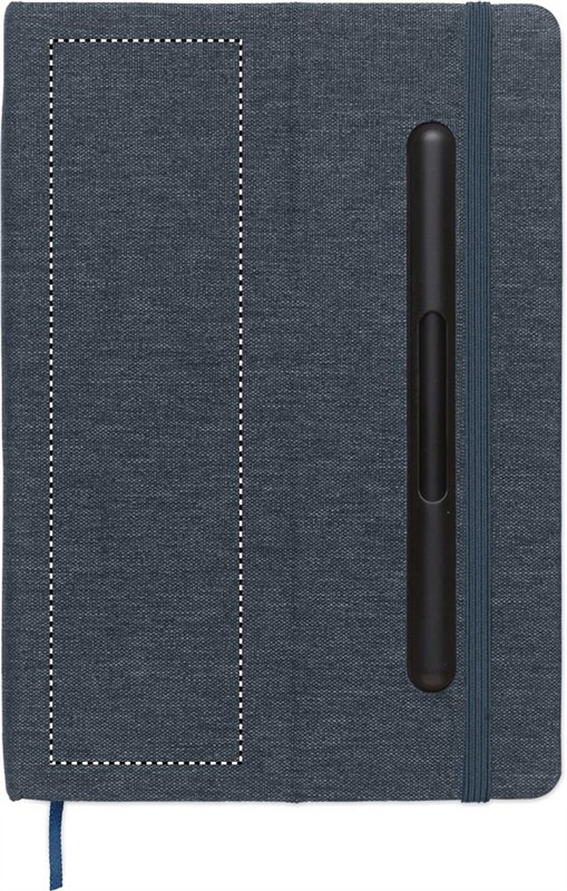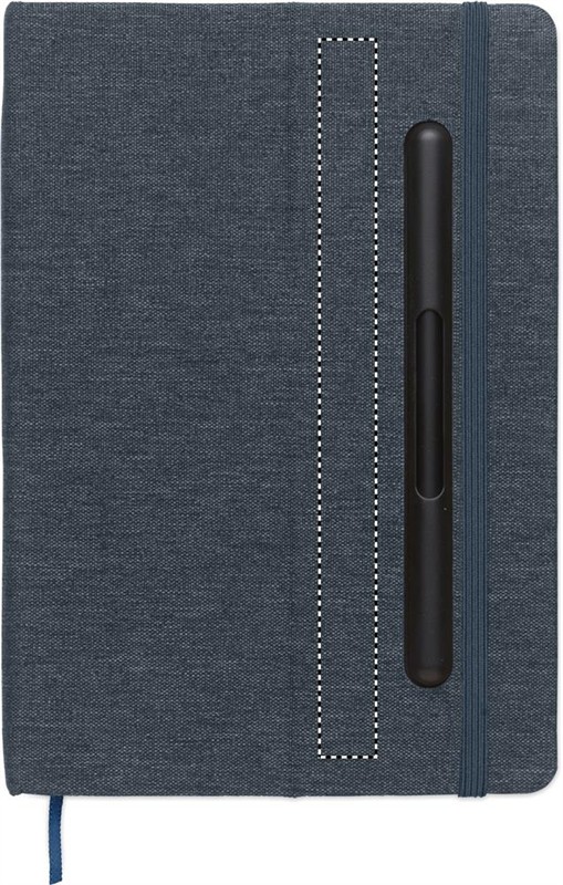 A5 jegyzetfüzet RPET keménytáblás borítóval, telefontámasz funkcióval. Integrált 2 az 1-ben tintamentes és normál golyóstoll ABS-ből. Cérnafűzött. 192 vonalas oldal (96 lap) újrahasznosított papírból. Színben illeszkedő zárópánt és könyvjelző szalag.