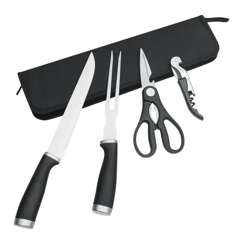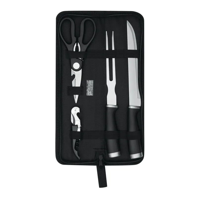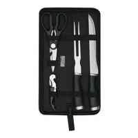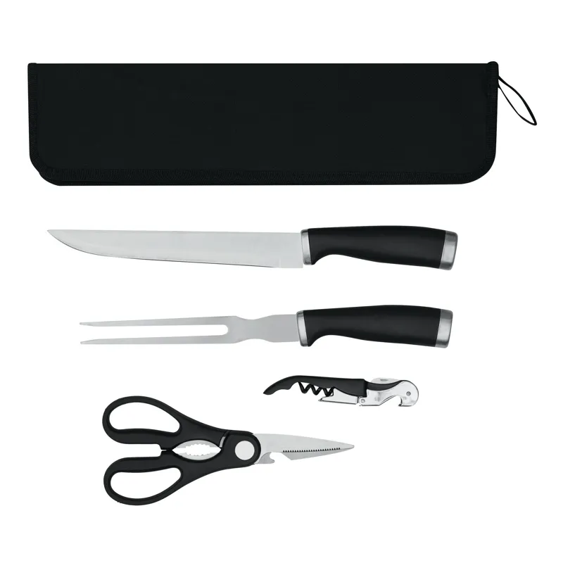 ROASTY rozsdamentes acél hússzeletelő kés szett, 4 részes: szeletelő kés, húsvilla, húsvágó olló és pincérbicska, fekete nejlon tasakban, akasztóval