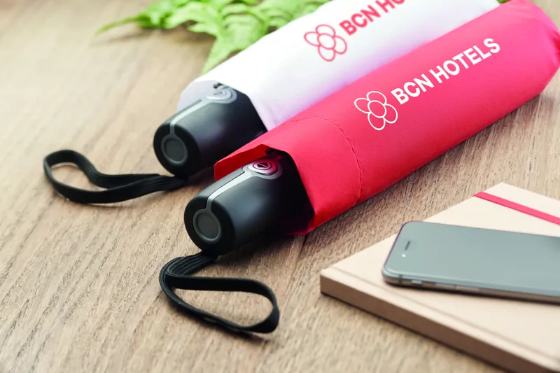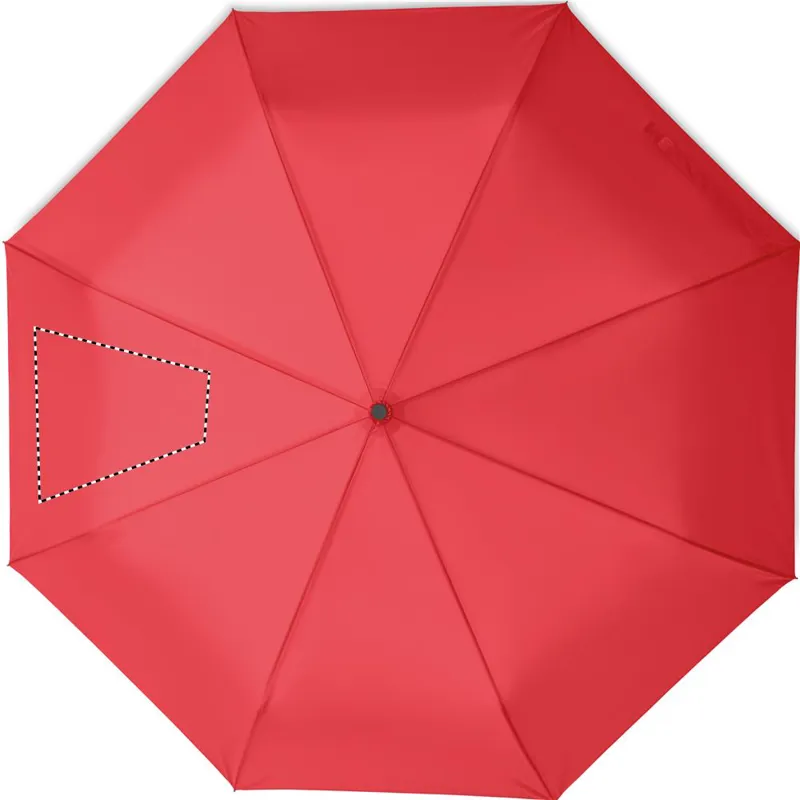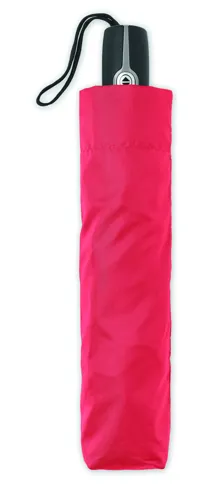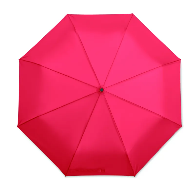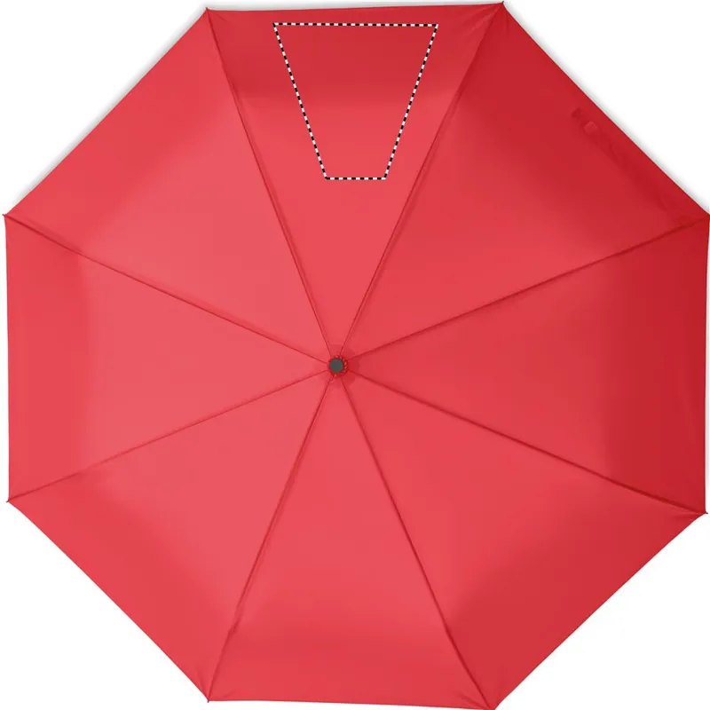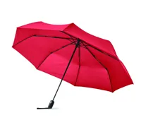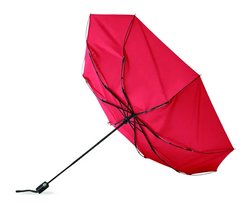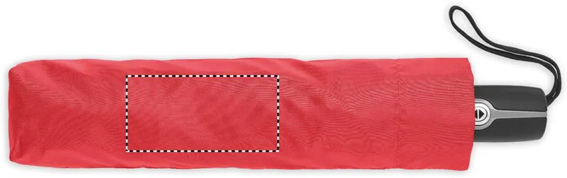 27 colos, 3 szakaszos összecsukható, automatikusan nyíló és záródó, szélálló esernyő. 190T nyersselyem anyagból készült, fekete bevonatos acél szárral. Üvegszálas bordák, fekete PP fogantyú nyomógombbal. Hozzáillő tokban.