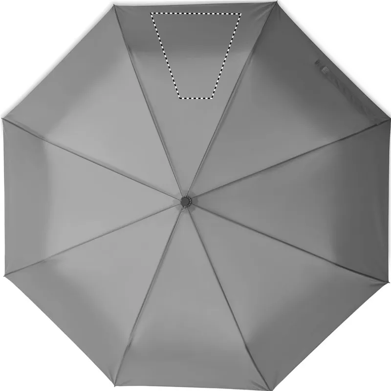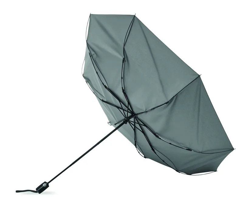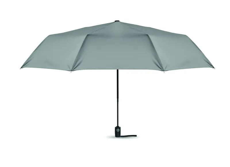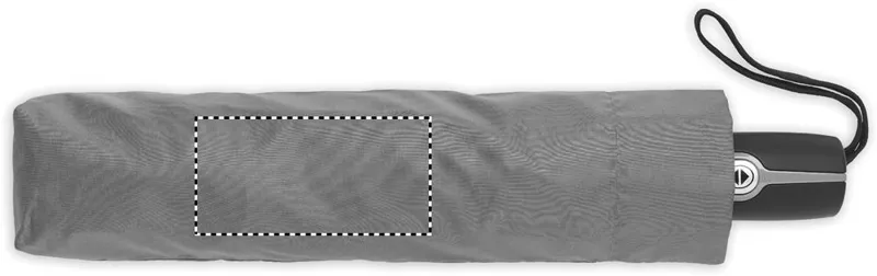 27 colos, 3 szakaszos összecsukható, automatikusan nyíló és záródó, szélálló esernyő. 190T nyersselyem anyagból készült, fekete bevonatos acél szárral. Üvegszálas bordák, fekete PP fogantyú nyomógombbal. Hozzáillő tokban.