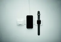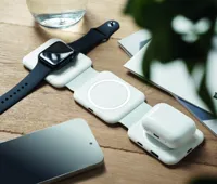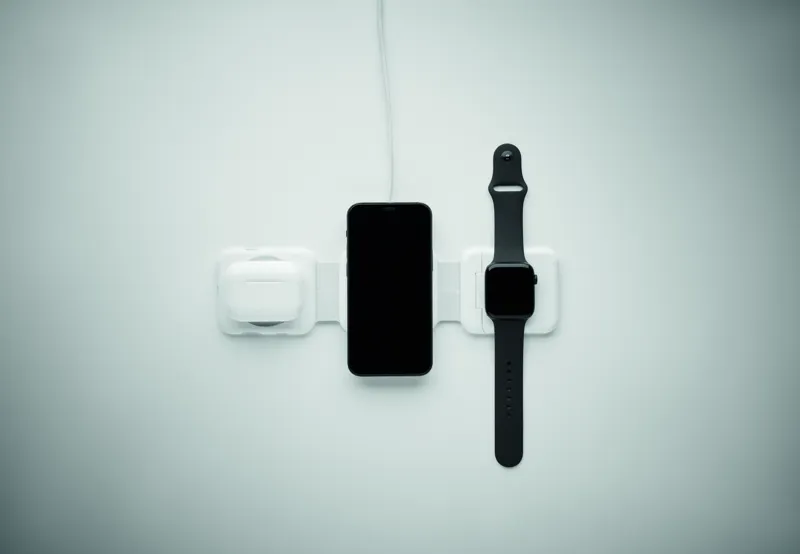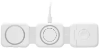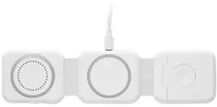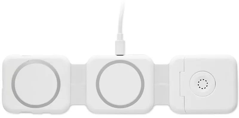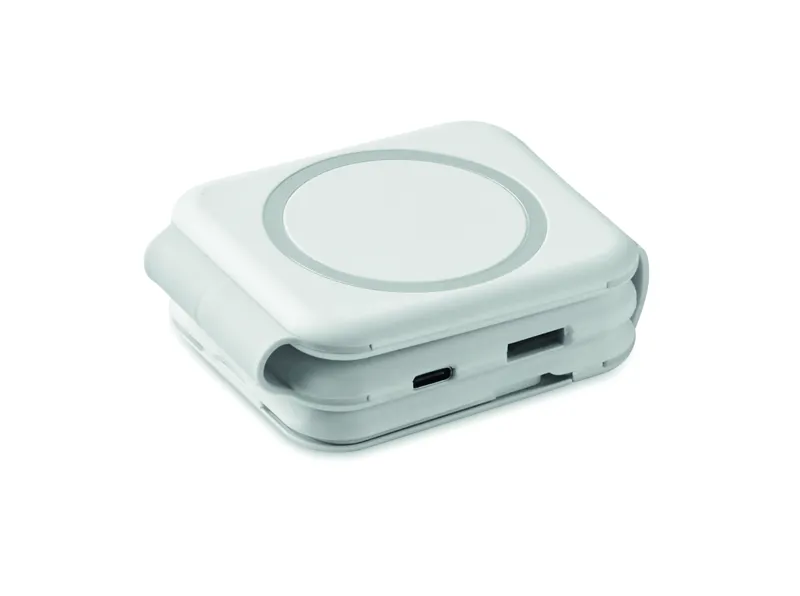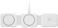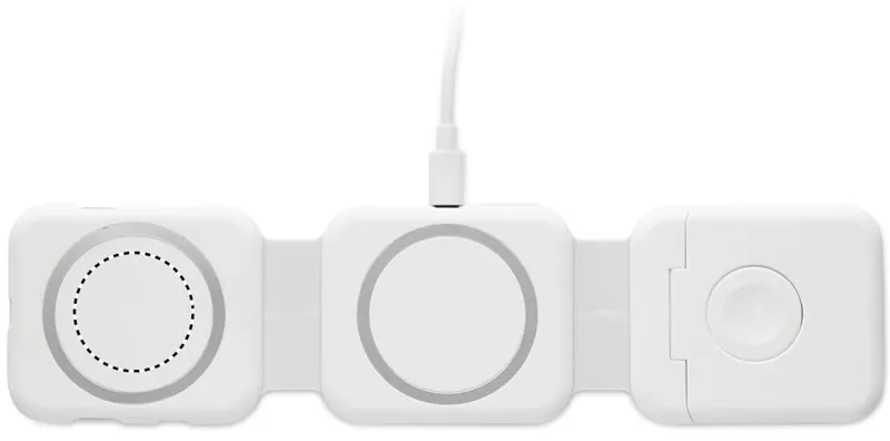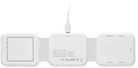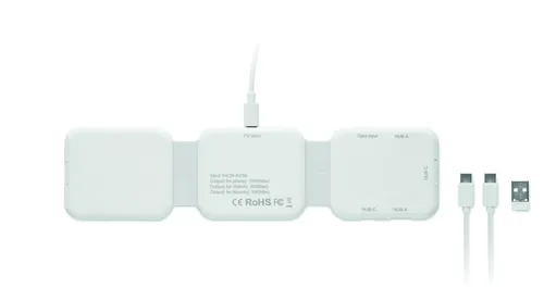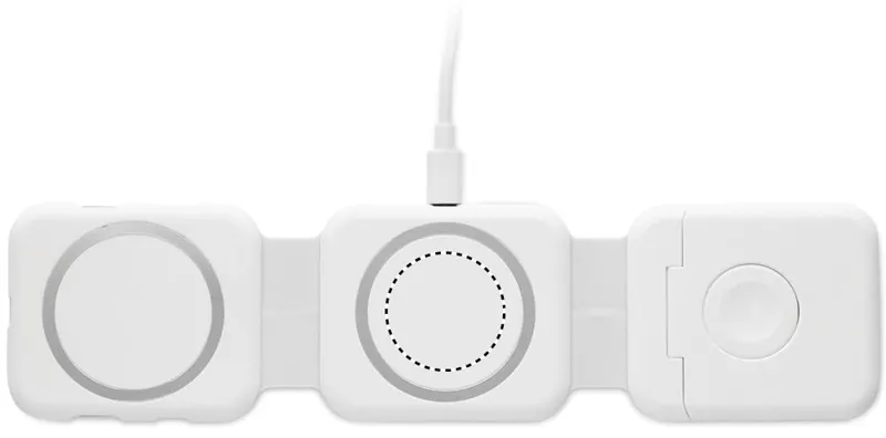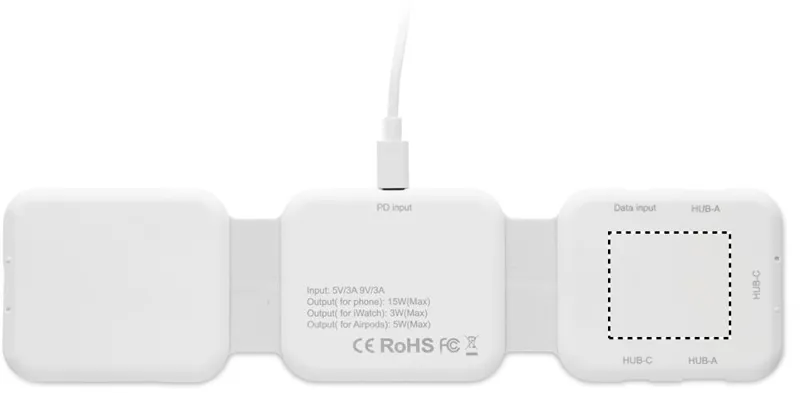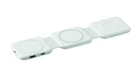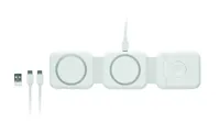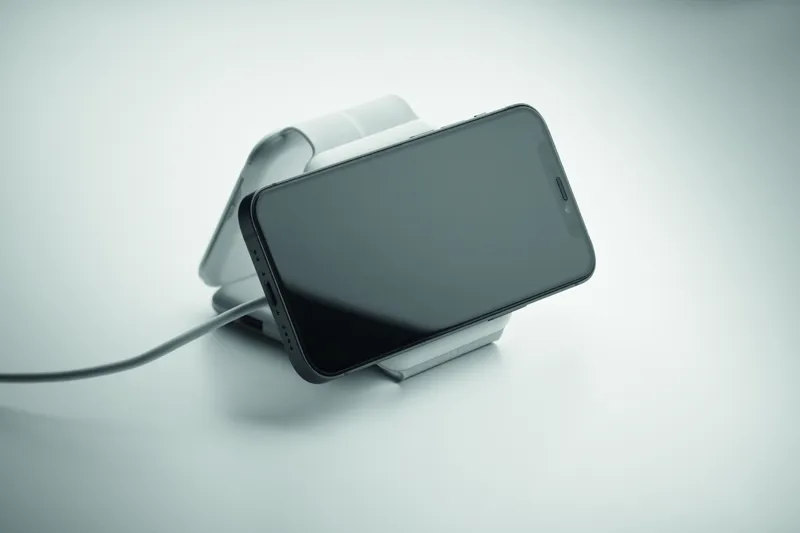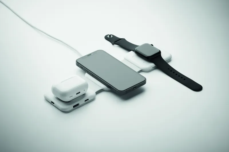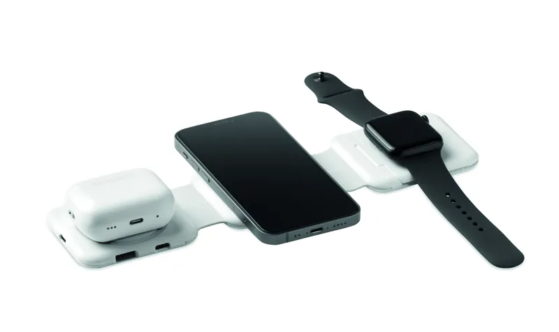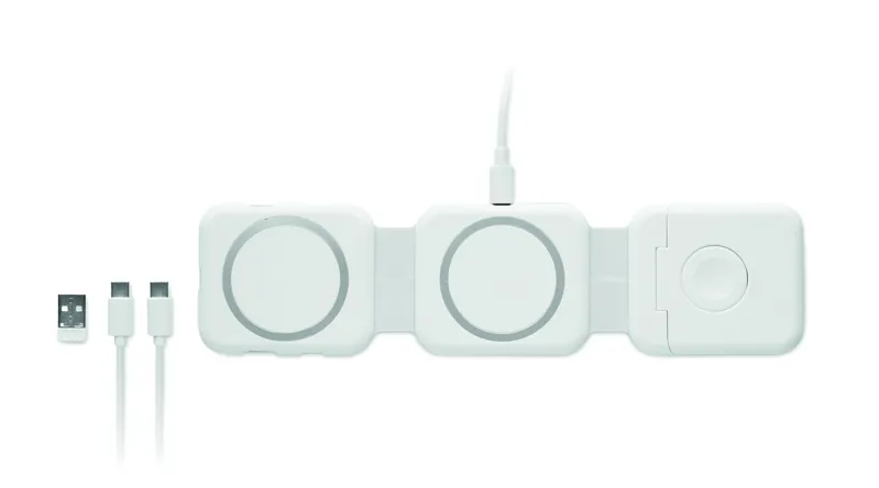 Mágneses töltőállomás ABS anyagból, 3 vezeték nélküli töltőfelülettel: 1×15W, 1×5W TWS-hez és 1 Apple Watch töltő (3W). 2 C-típusú és 2 USB-A porttal, beépített C-típusból USB-A-ba csatlakozó kábel.