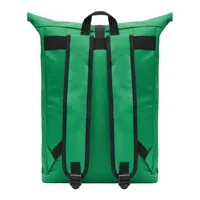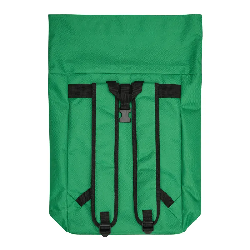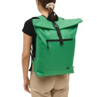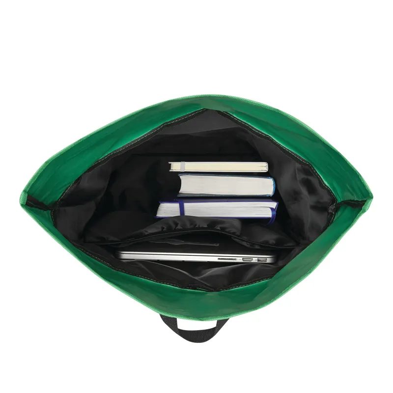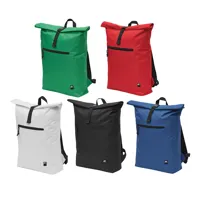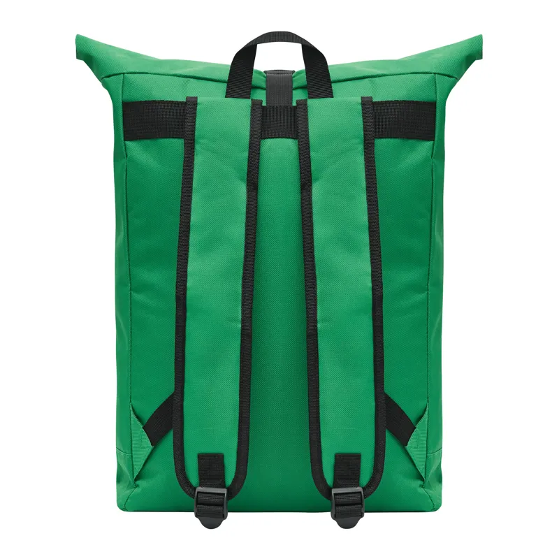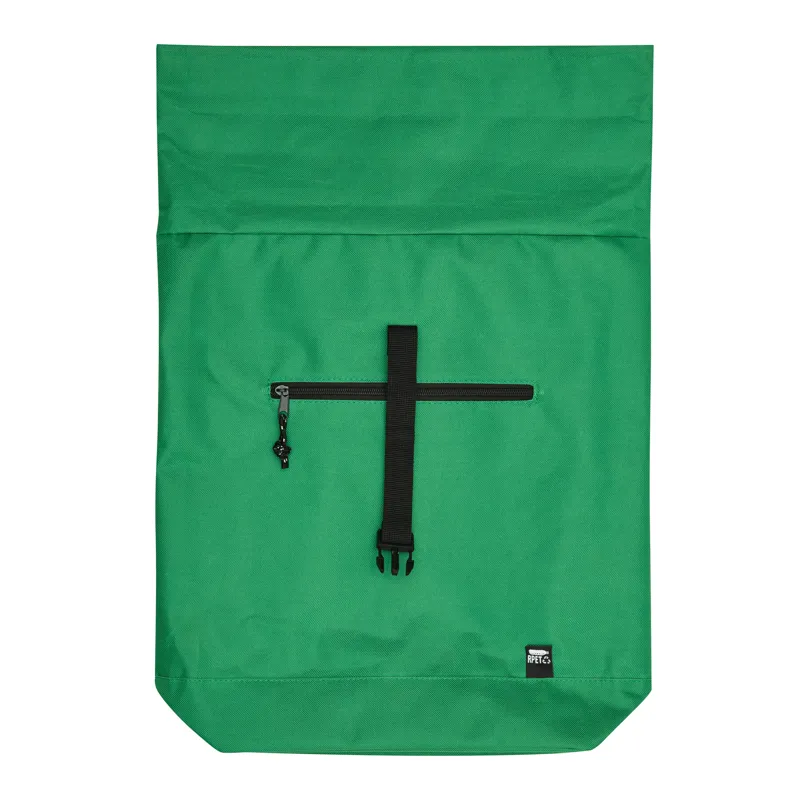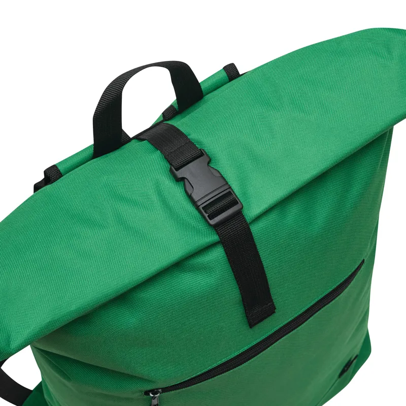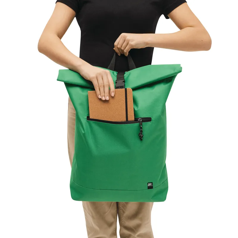 ROLL-TOP hátizsák: újrahasznosított műanyagból (RPET), cipzáras első rekesz, nagy fő rekesz párnázott belső rekesszel laptop vagy táblagép számára, teteje feltekerhető és csattal rögzíthető, fül, párnázott alsó rész, vállpántok, hátrész