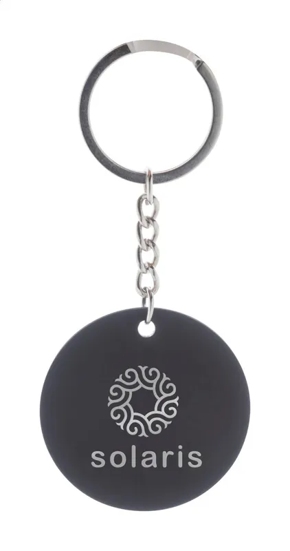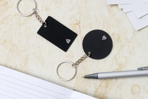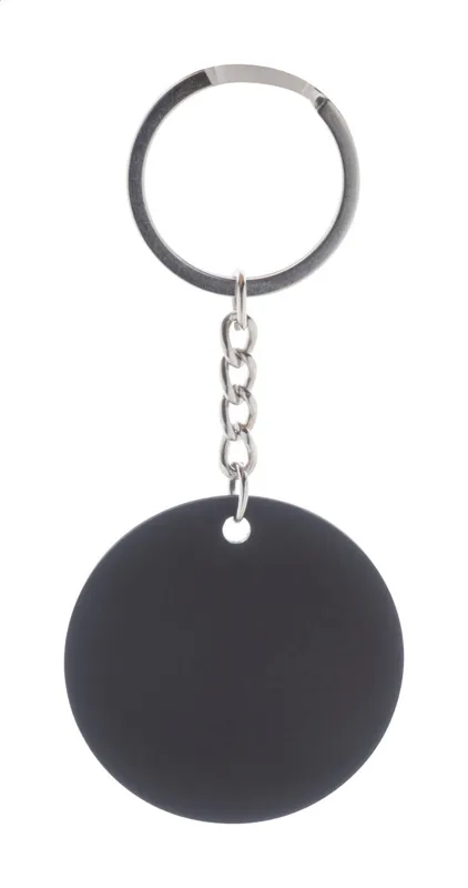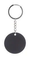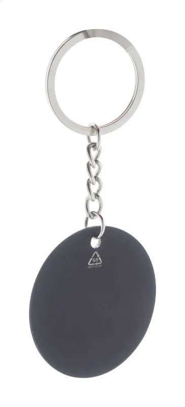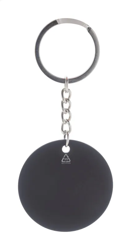 Kerek alakú, újrahasznosított rozsdamentes acél kulcstartó gumírozott felülettel. Speciális bevonattal tükögravírozáshoz.