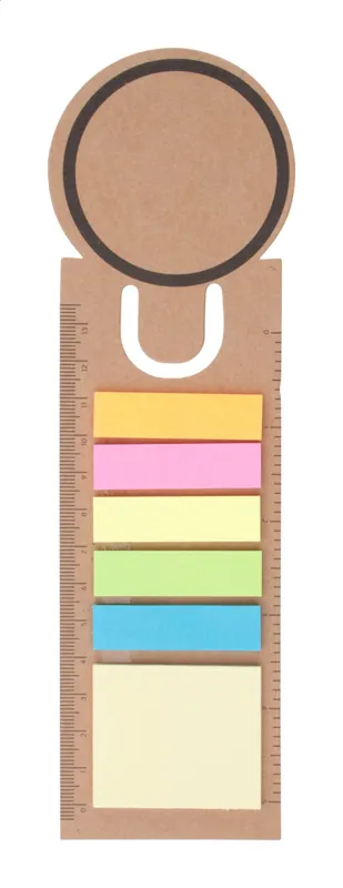 Papír könyvjelző öntapadós jegyzetlapokkal, oldalán vonalzóval.