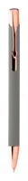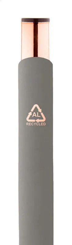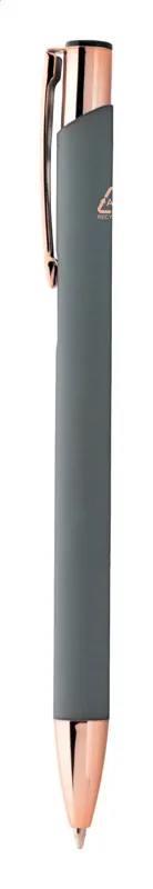Újrahasznosított alumínium golyóstoll gumírozott felülettel és rózsaarany részekkel. Speciális bevonattal rendelkezik, amely különlegesen fényessé teszi a gravírozott emblémát. Kék tollbetéttel szállítjuk.