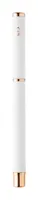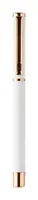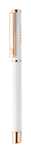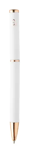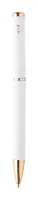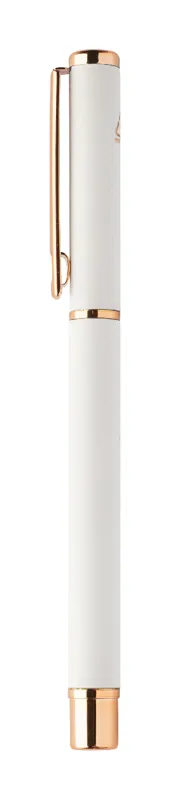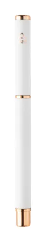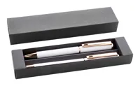 Újrahasznosított alumínium tollszett golyóstollal és rollertollal, gumírozott felülettel és rózsaarany részletekkel. Kék tollbetéttel. Speciális bevonattal a tükörlézeres gravírozáshoz rózsaarany színben. Fekete papír ajándékdobozban.