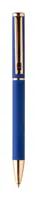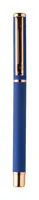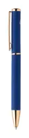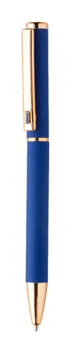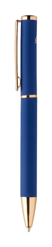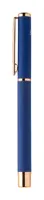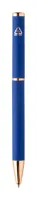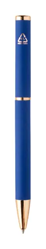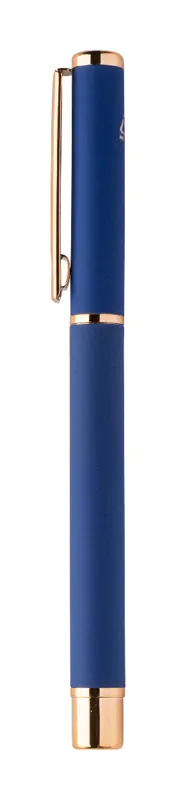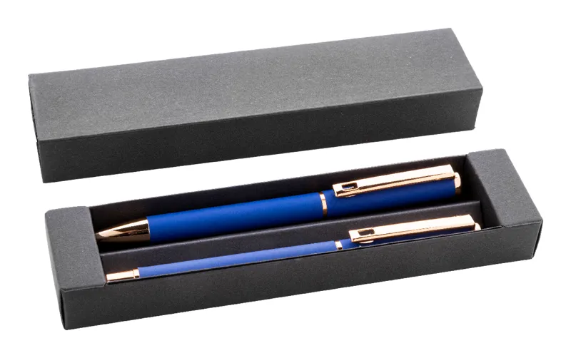 Újrahasznosított alumínium tollszett golyóstollal és rollertollal, gumírozott felülettel és rózsaarany részletekkel. Kék tollbetéttel. Speciális bevonattal a tükörlézeres gravírozáshoz rózsaarany színben. Fekete papír ajándékdobozban.
