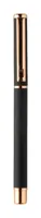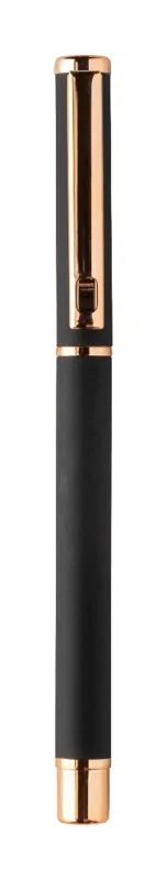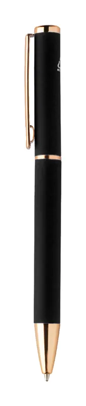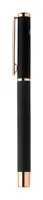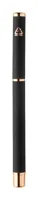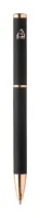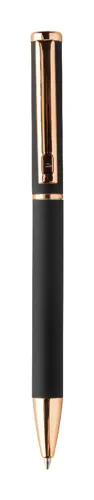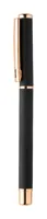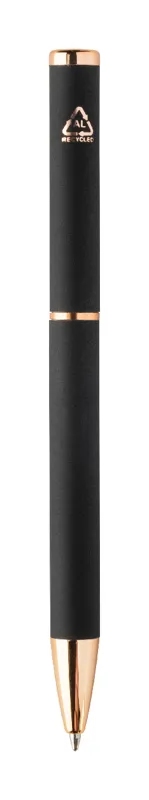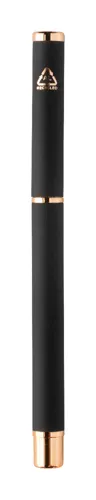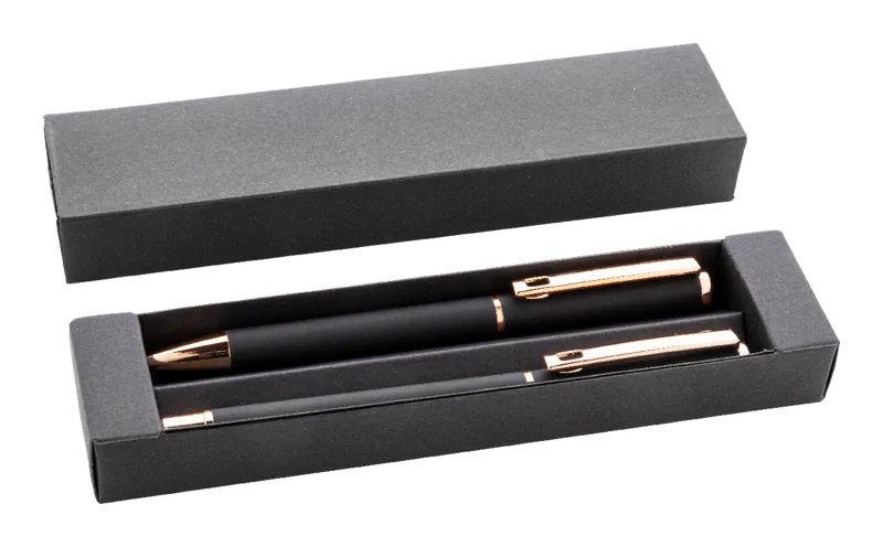Újrahasznosított alumínium tollszett golyóstollal és rollertollal, gumírozott felülettel és rózsaarany részletekkel. Kék tollbetéttel. Speciális bevonattal a tükörlézeres gravírozáshoz rózsaarany színben. Fekete papír ajándékdobozban.