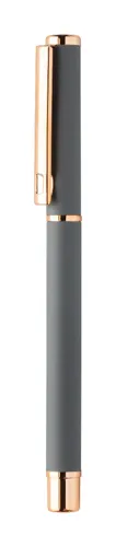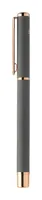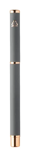 Újrahasznosított alumínium tollszett golyóstollal és rollertollal, gumírozott felülettel és rózsaarany részletekkel. Kék tollbetéttel. Speciális bevonattal a tükörlézeres gravírozáshoz rózsaarany színben. Fekete papír ajándékdobozban.