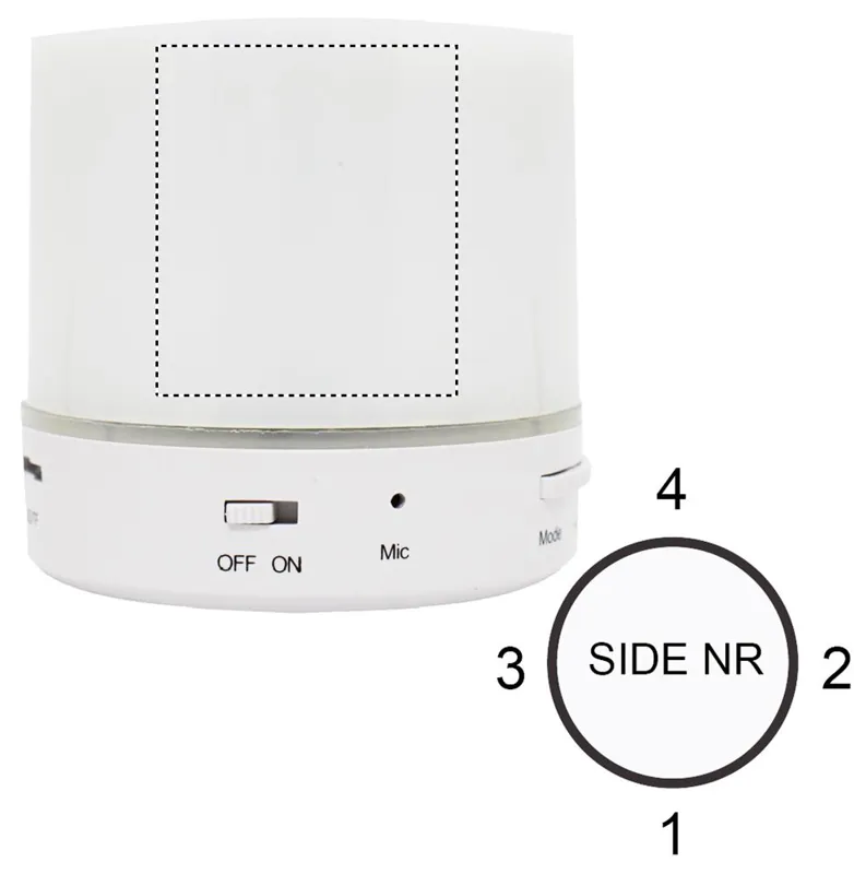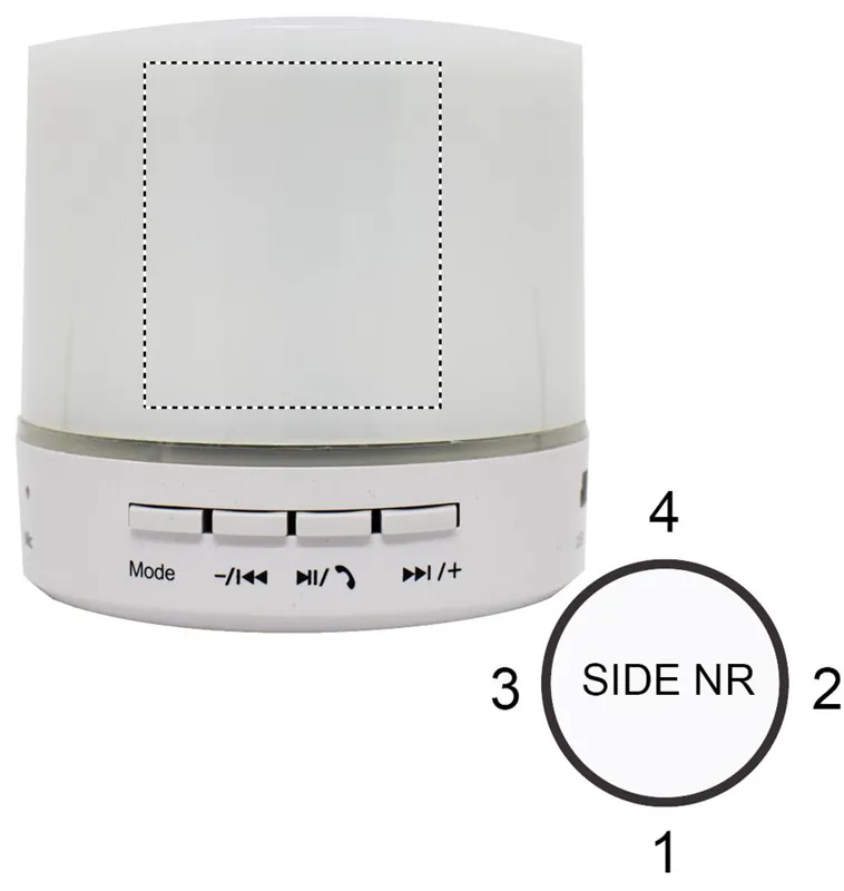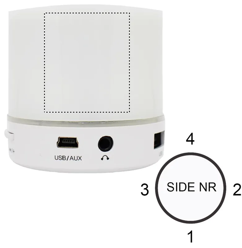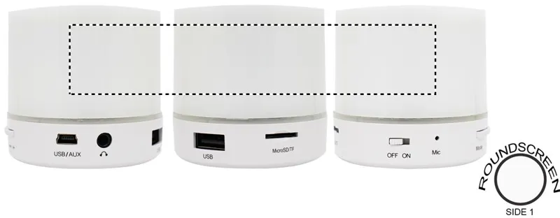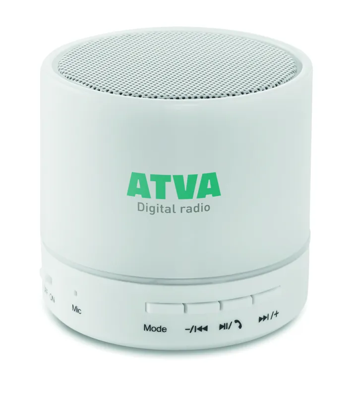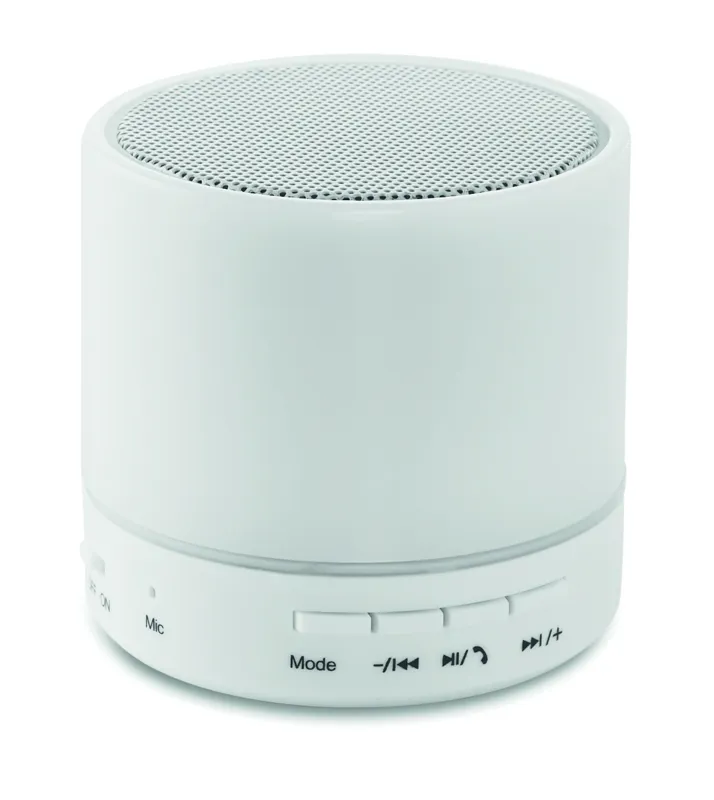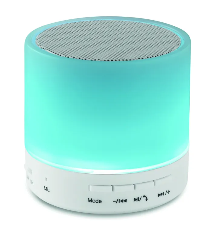 2.1 vezeték nélküli ABS hangszóró. Gumírozott felszín és LED jelzőfény. 3 különböző színű váltakozó fénnyel. A működéshez szükséges újratölthető 500 mAh lítium-ion elemmel szállítjuk. SD kártya port és AUX/ USB kábel. Telefon kihangosító funkció. Teljesítmény: 3W, 4 Ohm. Üzemidő kb. 2 óra.