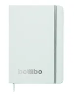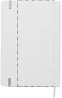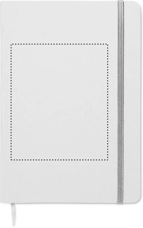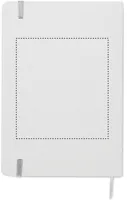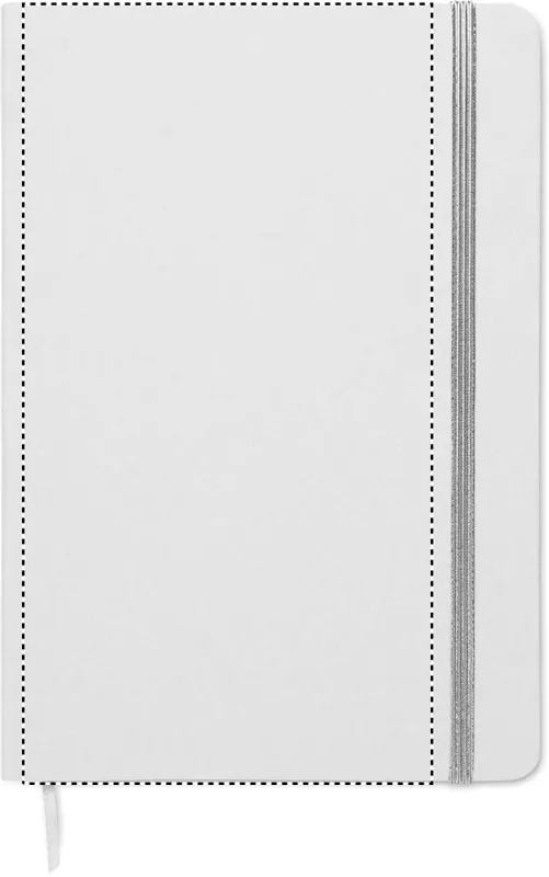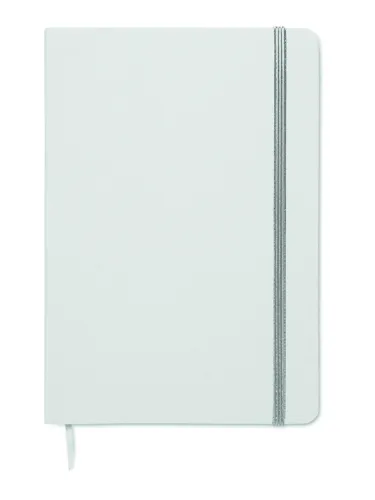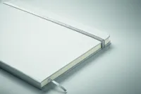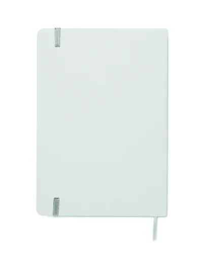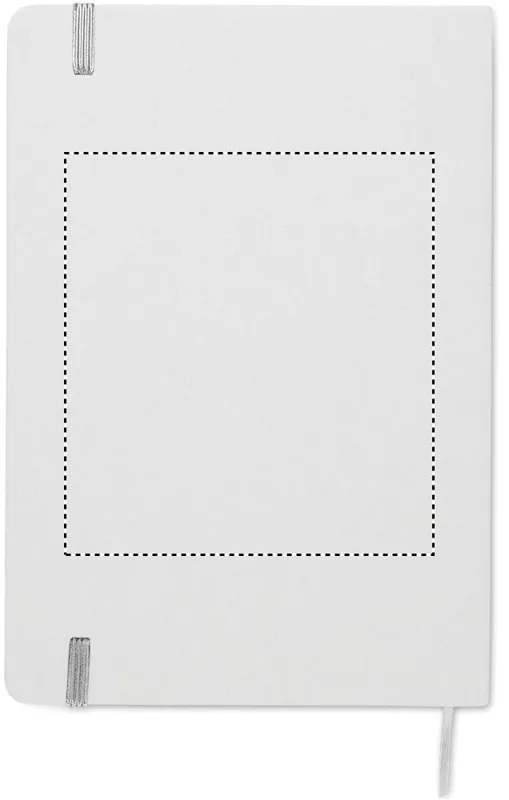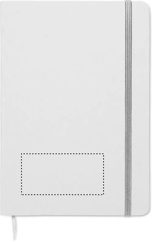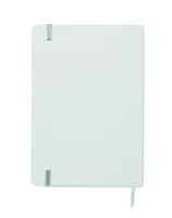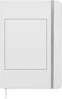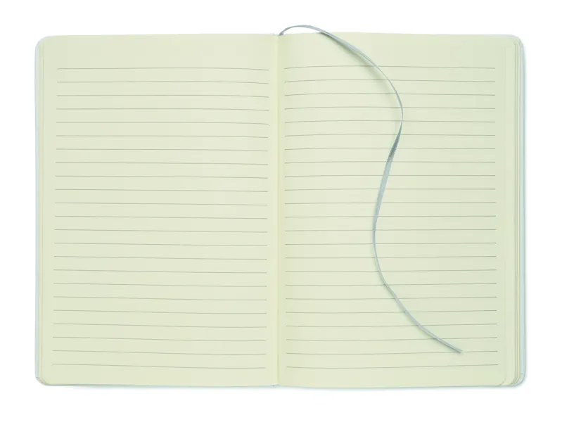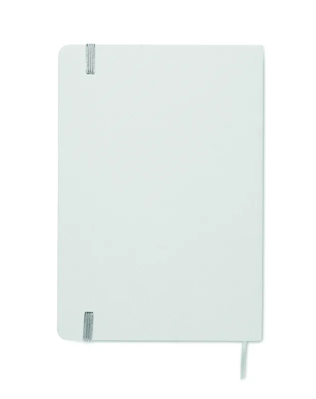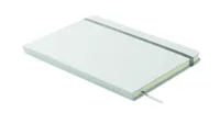 A5 keménytáblás jegyzetfüzet, 70%-ban újrahasznosított tejesdoboz csomagolásból és 30%-ban újrahasznosított papírból készült borítóval. Cérnafűzött. 160 vonalas oldal (80 lap) újrahasznosított papírból. Elasztikus zárópánt és könyvjelző szalag, melyek színe a gravírozás után, a fehér borító réteg alól megjelenő színhez illeszkedik.