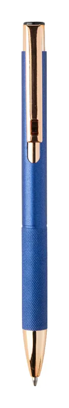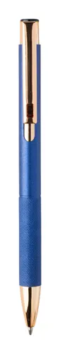 Újrahasznosított alumínium golyóstoll matt felületű testtel, texturált markolattal és rózsaarany részletekkel. Speciális bevonattal a tükörlézeres gravírozáshoz rózsaarany színben. Kék tollbetéttel.