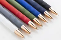 Újrahasznosított alumínium golyóstoll gumírozott testtel és rózsaarany részletekkel. Speciális bevonattal a tükörlézeres gravírozáshoz rózsaarany színben. Kék tollbetéttel.
