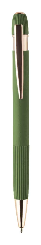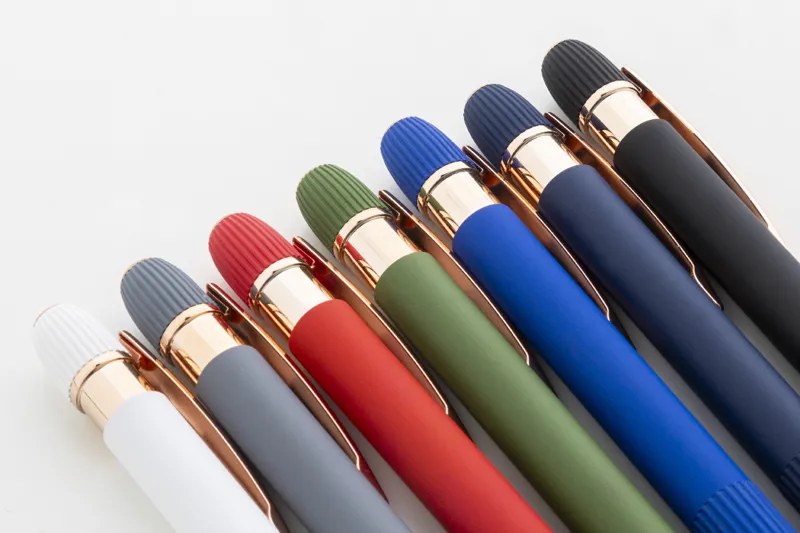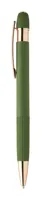 Újrahasznosított alumínium golyóstoll gumírozott testtel és rózsaarany részletekkel. Speciális bevonattal a tükörlézeres gravírozáshoz rózsaarany színben. Kék tollbetéttel.