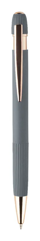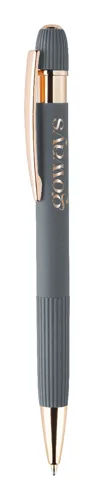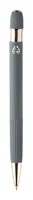 Újrahasznosított alumínium golyóstoll gumírozott testtel és rózsaarany részletekkel. Speciális bevonattal a tükörlézeres gravírozáshoz rózsaarany színben. Kék tollbetéttel.