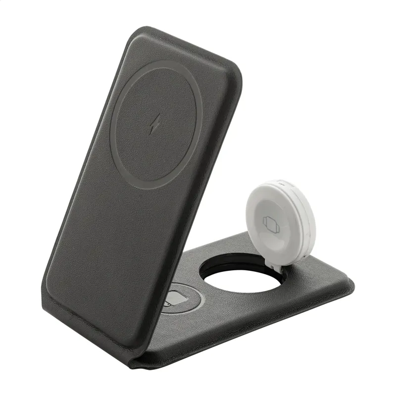 Luxus, összecsukható mobiltelefon-tartó és vezeték nélküli töltő szett újrahasznosított PU bőrből. Mágneses vezeték nélküli gyorstöltővel (15W), vezeték nélküli töltővel (5W) fülhallgatókhoz (csak Apple®) és vezeték nélküli töltővel (2,5W) okosórákhoz (Apple® és Samsung®). Öntapadó fémgyűrűvel, amellyel bármilyen vezeték nélkül tölthető eszközön használhatja a mágneses funkcióját. Kompatibilis az iPhone® 12 vagy újabb készülékkel. USB töltőkábellel.