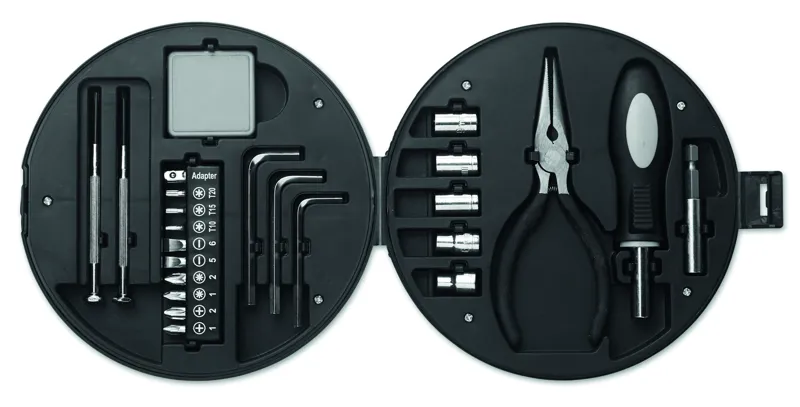 25 darabos szerszámkészlet gumiabroncs alakú dobozban. Tartalma: 1 csavarhúzó nyél, 1 hosszabbító, 1 laposfogó, 5 csőkulcs, 3 imbuszkulcs, 10 bitfej (behajtóhegy), 2 precíziós csavarhúzó és 1 mérőszalag.
