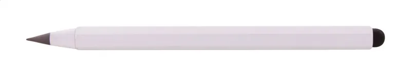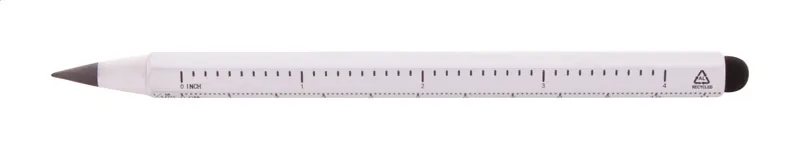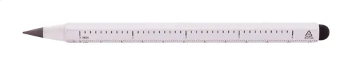 Újrahasznosított alumíniumból készült, hosszantartó tintamentes toll érintőképernyős gombbal és fémötvözet heggyel, amely oxidálja a papírt. Hatszögletű markolattal, 11 cm-es és 4 hüvelykes vonalzóval. Ez a toll egy ceruzához hasonlóan ír és radírozható.